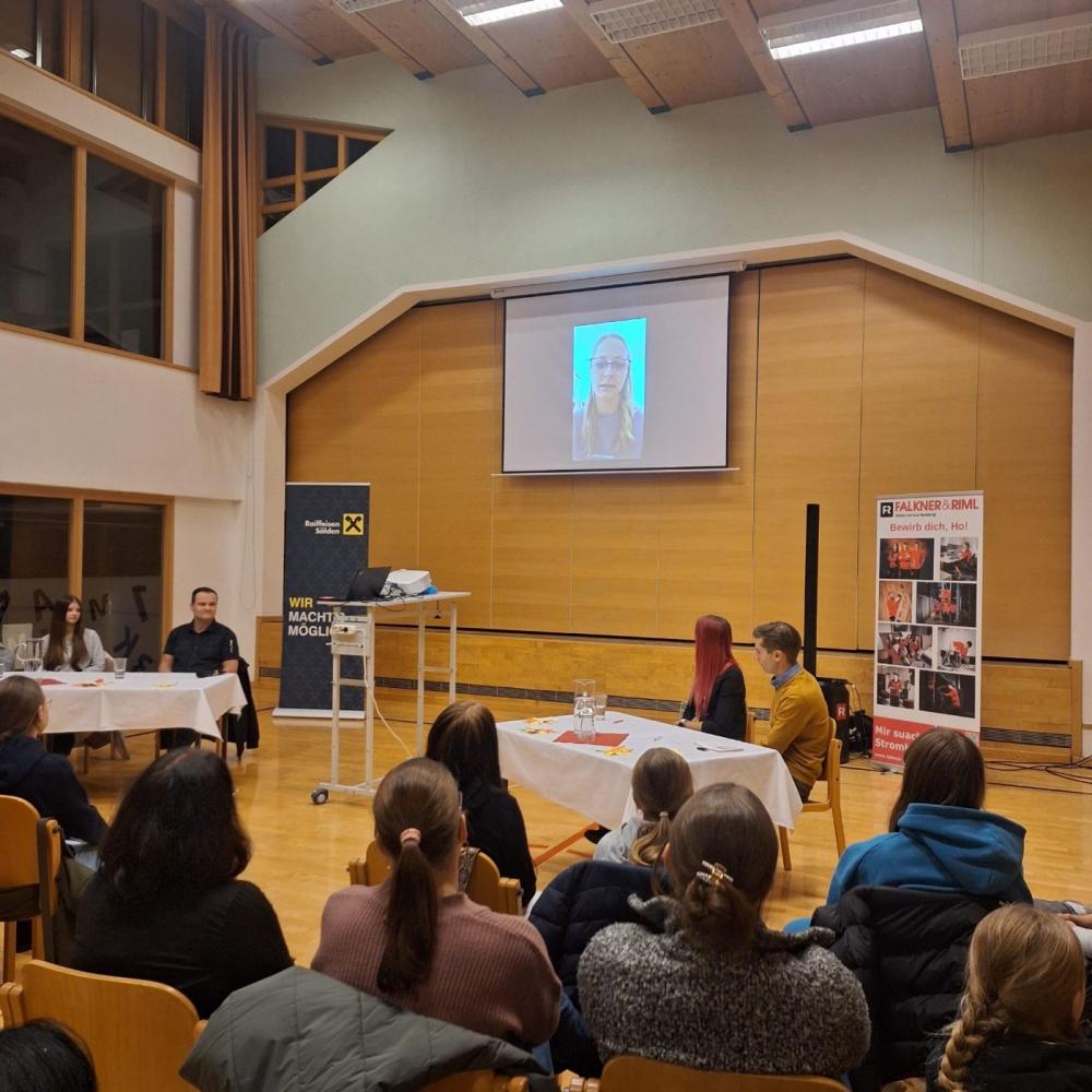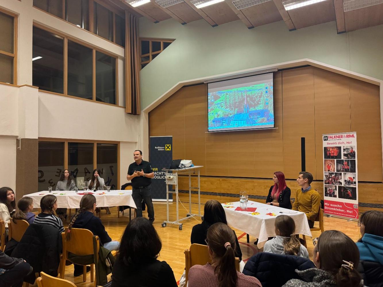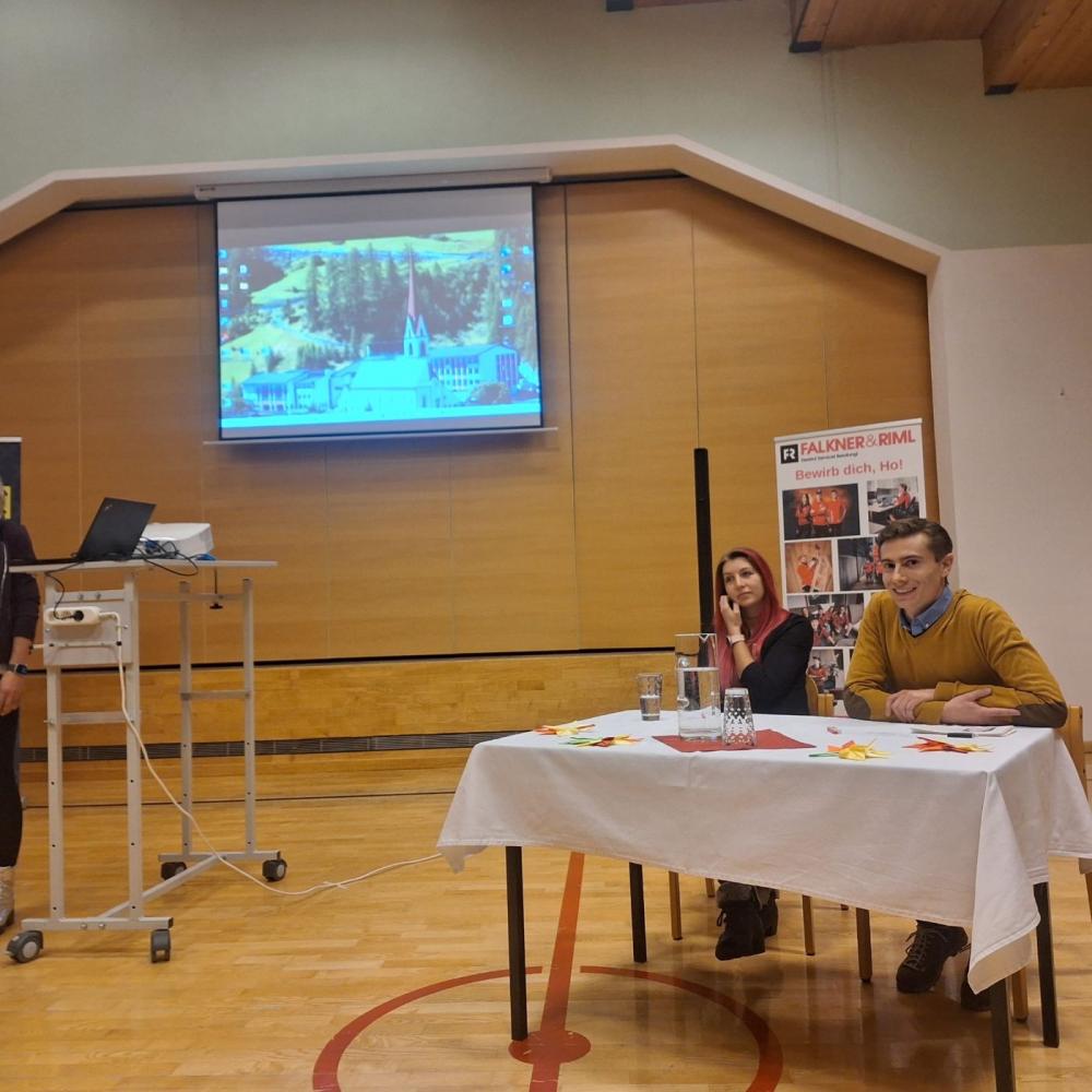 - PTS Ötztal, vertreten durch Direktor Martin Reder, der zwei unserer ehemaligen Schülerinnen – Lea und Alina Prantl – mitbrachte. Die beiden berichteten offen über ihre bisherigen Erfahrungen und welche Pläne sie für die nähere Zukunft haben.