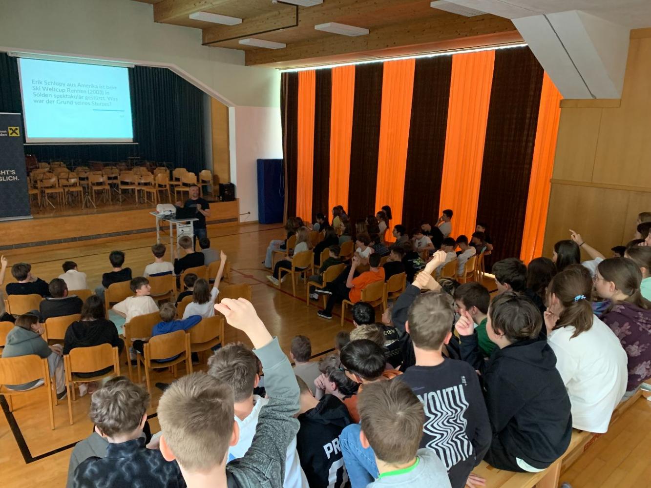 Heute durften wir den Skiklub Sölden an unserer Schule begrüßen. In einer abwechslungsreichen Präsentation stellten die Vertreter:innen die Angebote des Skiklubs vor und zeigten eindrucksvolle Videos, in denen Schüler:innen erzählten, warum sie mit Begeisterung Skifahren und Mitglied im Klub sind. Der Spaß am Sport und der Zusammenhalt innerhalb der Gruppe standen dabei im Mittelpunkt.