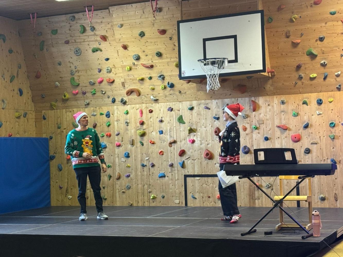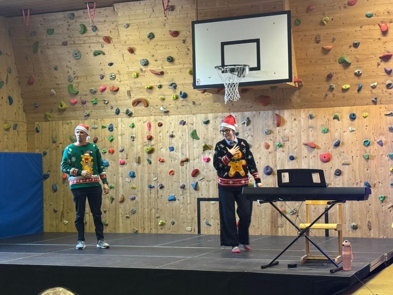 Durch das abwechslungsreiche Programm führten unsere Lehrpersonen Lukas Kuprian und Theresa Helbock – und das mit viel Humor! Lukas, der eigentlich kein großer Weihnachtsfan ist, wurde von Theresa immer wieder versucht zu überzeugen. Nach den vielen tollen Aufführungen konnte sogar er sich schließlich auf Weihnachten freuen.